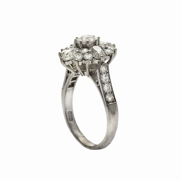 MATERIALE: oro bianco e diamanti DESCRIZIONE: anello, di ispirazione floreale, realizzato con al centro diamante taglio cuscino impreziosito ai lati da altri quattro diamanti taglio cuscino alternati a diamanti taglio brillanti disposti a gruppi di tre, diamanti taglio brillante si ritrovano ai lati, reca il marchio 18 Kt MISURE: anello 22 PESO: diamanti ct 1.60, gr 8.5