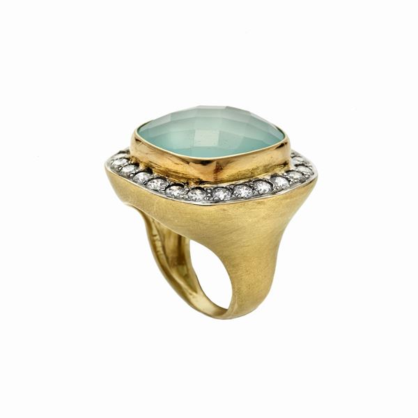 MATERIALE: oro giallo, diamanti e acquamarina DESCRIZIONE: grande anello di forma rettangolare, realizzato con al centro acquamarina taglio rosa coronè incorniciata da diamanti taglio brillante, su base sagomata in oro giallo satinato, reca il marchio 18 kt MISURE: anello 11 PESO: diamanti ct 1.0, gr 19.3