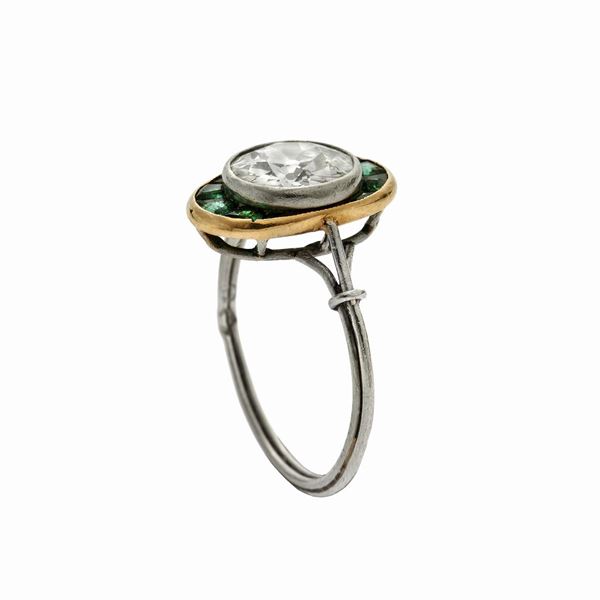 MATERIALE: oro bianco, oro giallo diamante e smeraldi DESCRIZIONE: anello solitario con al centro diamante taglio vecchio impreziosito da smeraldi taglio trapezoidale MISURE: anello 12 PESO: diamante ct 1.80, colore H, purezza SI, gr 3.2