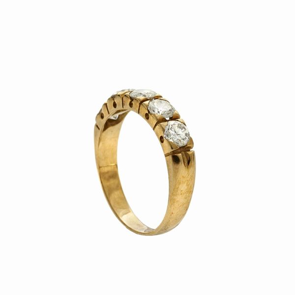 MATERIALE: oro giallo e diamanti DESCRIZIONE: anello in oro giallo realizzato con al centro cinque diamanti taglio brillante MISURE: anello 20 PESO: diamanti ct 1.50, colore G, purezza VS, gr 4.7
