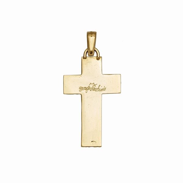 MATERIALE: oro giallo e oro rosso DESCRIZIONE: pendente realizzato come una croce, di ispirazione geometrica, base realizzata con forme geOmetriche disposte su più livelli, firmata Giorgio Facchini, reca il marchio 750, pezzo unico MISURE: cm 6x3 PESO: gr 16.20
