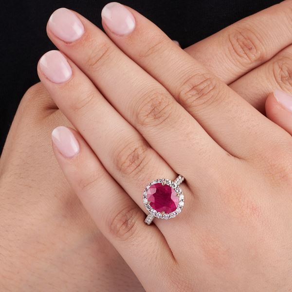 rubino Birmano, taglio ovale di ct 5.08, il rubino presenta trattamento termico e diamanti taglio brillante per ct 1.10, gr 6.7