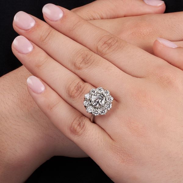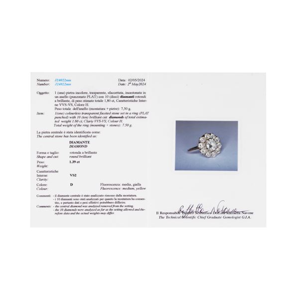 Misura 12diamanti di contorno taglio brillante per ct 1.60, colore H, VVS-VS e diamante centrale di ct 1.39, colore D, VS2, la pietra presenta un effetto fish-eye, gr 7.5 corredato di certificato R.A.G numero J24022mn, in data 02.05.2024indrio