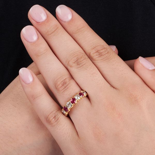 Anello riviere in oro giallo 18 kt, diamanti e rubini