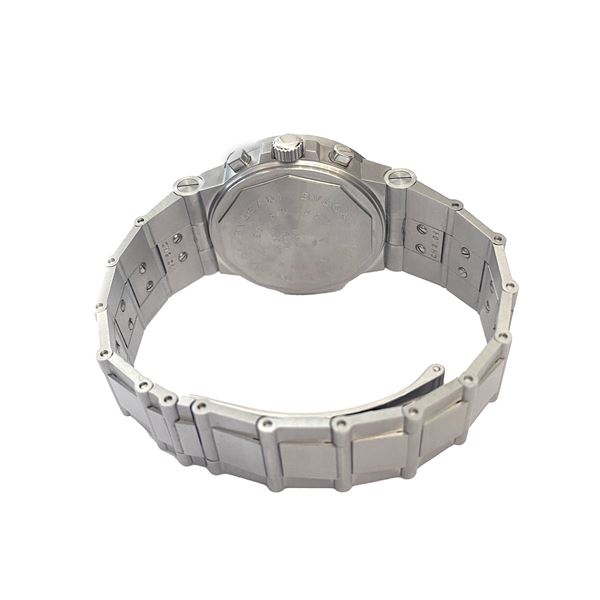 cassa in acciaio, lunetta in acciaio con incisa la firma Bulgari, quadrante bianco con indici applicati in acciaio, datario tra ore quattro e ore cinque, movimento a carica automatica, bracciale in acciaio, fibbia doppia deployant marcata Bulgari, ottimo stato di conservazioni