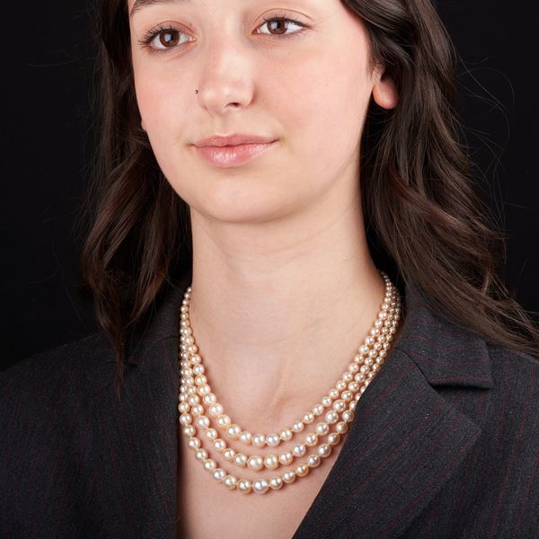 Collana a tre fili di perle degradè, oro bianco e diamanti