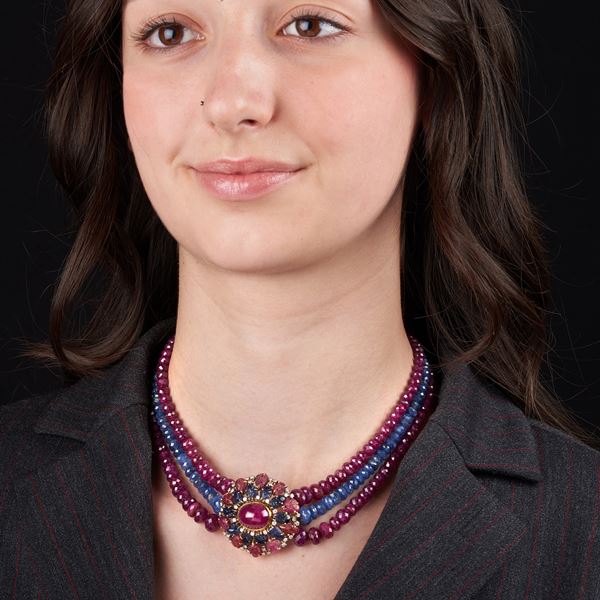 Aperta lunghezza cm 39perle in rubini e zaffiri per ct 300 circa, rubini e zaffiri incisi per ct 20 circa, rubino taglio cabochon ovale (nella parte centrale del fiore) di 9 circa e grande rubino taglio cabochon di ct 40, gr 109.3