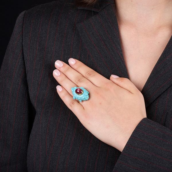 Grande anello in oro bianco, oro giallo, turchese e rubino stellato
