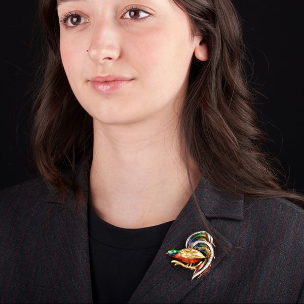 Grande spilla Fenice in oro giallo 18 kt, oro bianco, diamanti e smalti policromi
