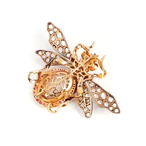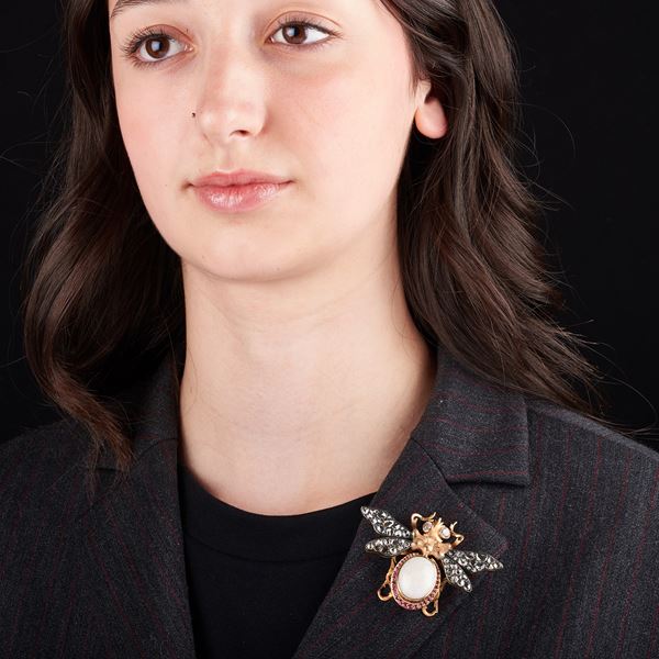 Grande spilla Mosca in oro giallo, argento, diamanti e opale