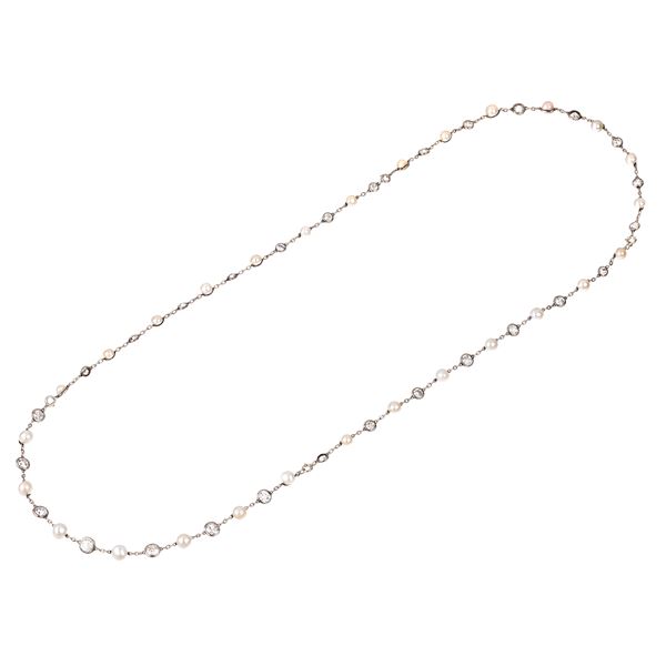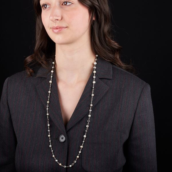 Lunga Collana trasformabile in quattro bracciali in platino, diamanti e perle