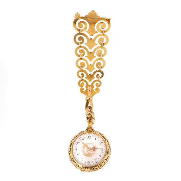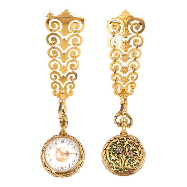 Orologio da tasca in oro giallo 18 kt, diamanti e smalto verde con spilla floreale in oro giallo