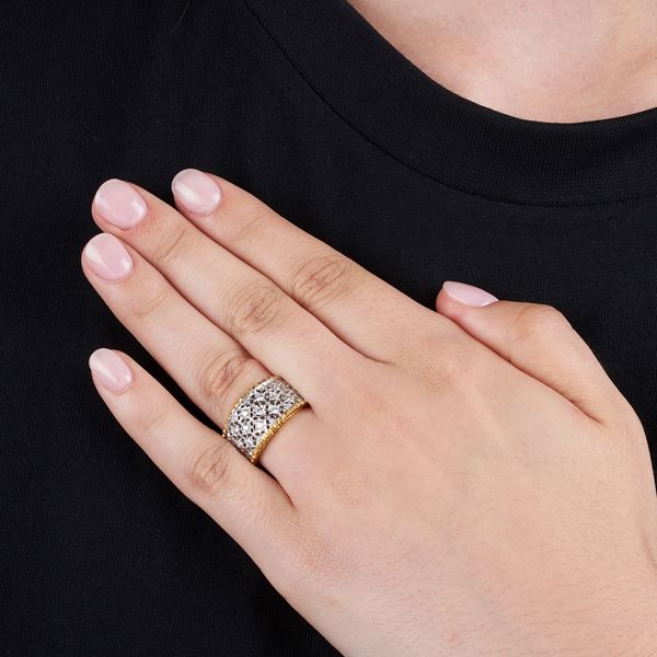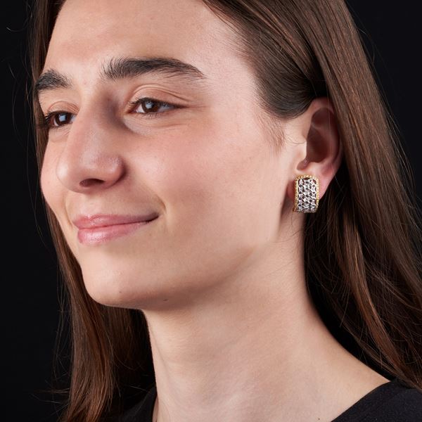 Paio di orecchini e anello in oro bianco 18 kt, giallo e diamanti