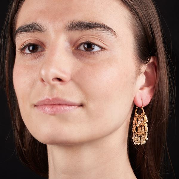 Paio di orecchini pendenti e anello in oro giallo 18 kt e microperle