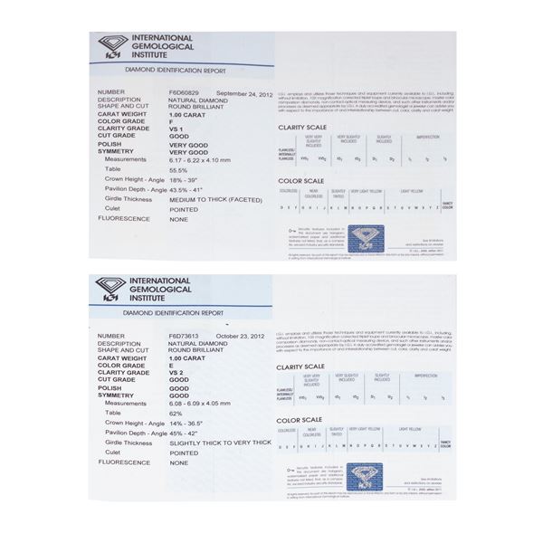 Diamante aglio brillante di ct 1.0. colore F, VSI, corredato di certificato IGI num F6D60829 del 24.09.2021 e diamante taglio brillante di ct 1.0 colore E, VS2, corredato di certificato IGI num.F6D73613 del 23.10.2012
