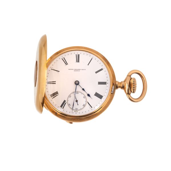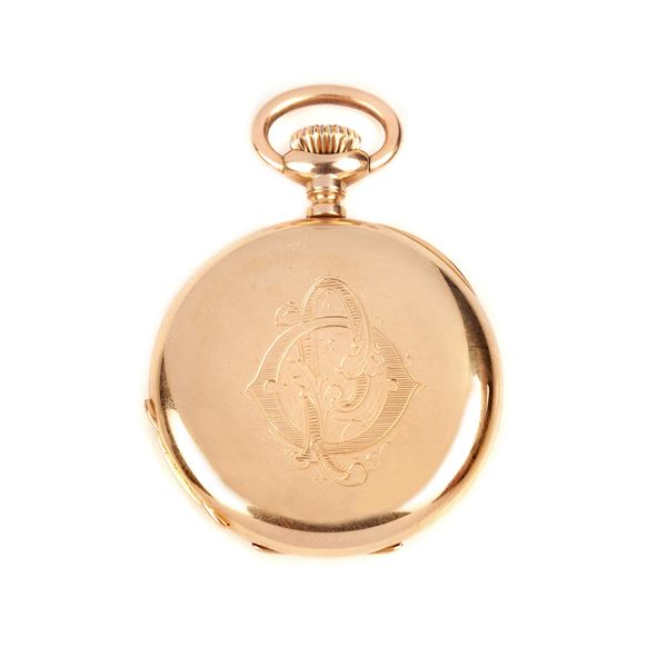 diametro mm 45cassa in quattro parti in oro giallo 18kt, quadrante in porcellana, numeri romani, contatore dei secondi a ore sei, movimento a carica manuale funzionante, vetro plastica. Nella cassa interna è incisa una dedica e nella cassa posteriore sono incise due iniziali, gr 89.1