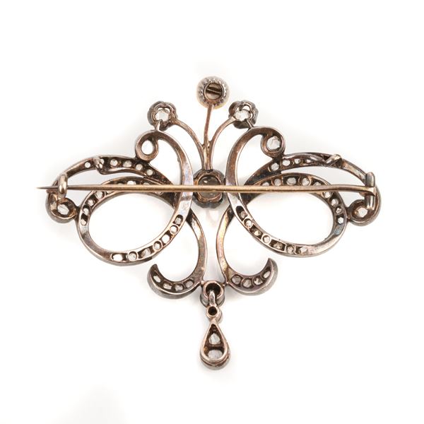 Spilla in argento, oro a basso titolo, diamante e perla mabè