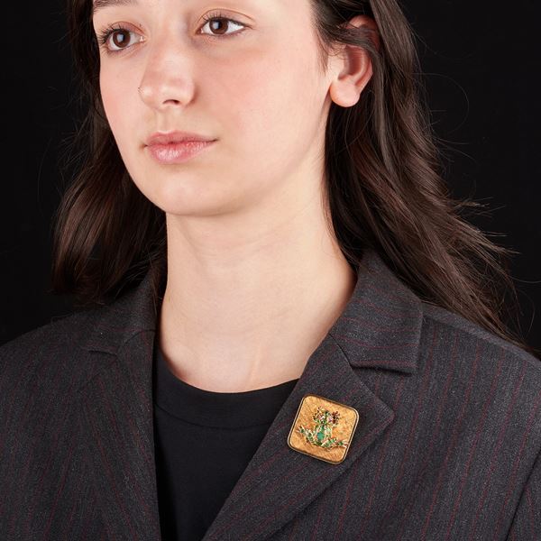Spilla Ranocchia in oro giallo 18 kt, smeraldi e rubini