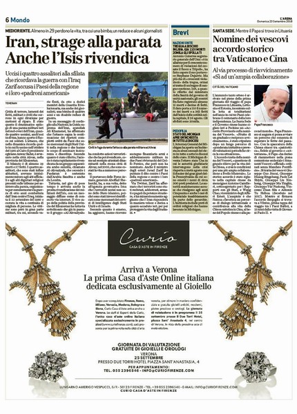 Firenze, settembre 2018 - Dopo aver conquistato Firenze, Roma, Milano, Venezia, Modena, Bologna e Siena, Curio Casa d’Aste arriva anche a Verona. Lo staff di Esperti della Curio, l’unica casa d’aste online italiana specializzata esclusivamente in preziosi (www.curiofirenze.com), sarà presente per la prima volta nella città d’arte veneta, per stimare in maniera confidenziale e gratuita gioielli antichi, moderni, pietre preziose e orologi. La giornata di valutazione è in programma il 25 settembre presso il Due Torri Hotel, piazza Sant’ Anastasia 4, nel centro di Verona, in vista della prossima asta di metà ottobre.