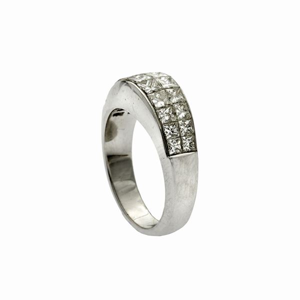MATERIAL: white gold and diamonds DESCRIPTION: slightly rounded ring, made with the middle two parallel rows of princess-cut diamonds, bears the mark 18 kt MEASURES: ring 6 WEIGHT: diamonds ct 1.80, 7.5 gr